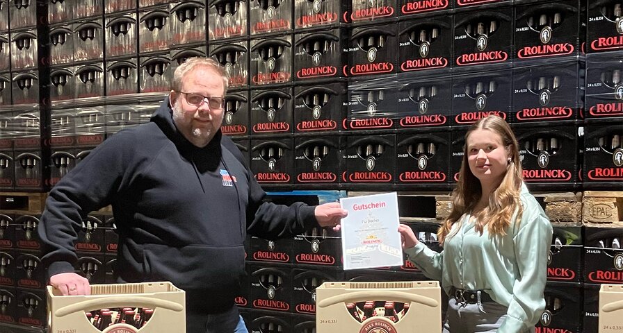 2.156 gültige Tipps standen in diesem Jahr bei Rolinck Werksleiter Marcel ter Steege auf der Teilnehmerliste. Da gleich mehrere die runde Zahl von 1100 cm als Tipp abgegeben hatten, wurde mittels Losverfahren über die Vergabe des Hauptpreises entschieden. Freuen durfte sich am Ende Pia Doeker aus Steinfurt. Die 18-Jährige hat sich ihren Gutschein über einen Jahresvorrat aus dem Rolinck Sortiment und die ersten der 52 Kästen bereits in der Brauerei abgeholt. Die Plätze zwei bis 21 wurden mit je einem Kasten sowie einem Alex Hoodie belohnt.